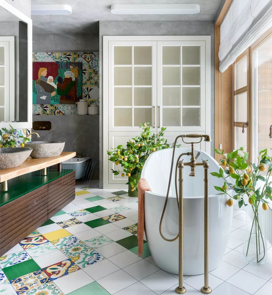如果您的目标是明亮的浴室,请选择具有活跃图案和原始装饰的瓷砖。