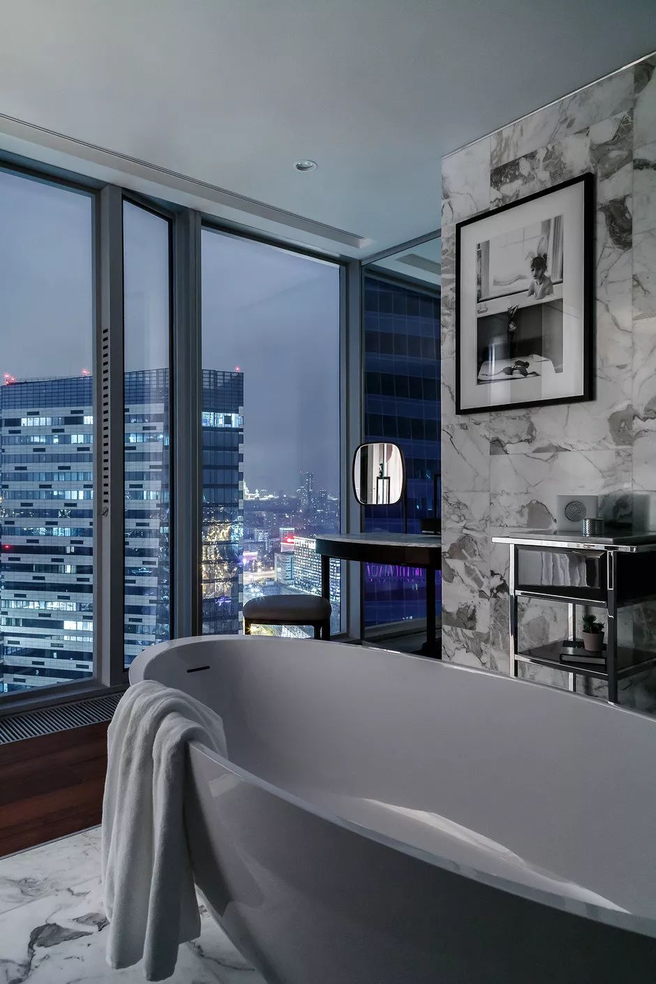 城市公寓中的独立式浴缸很豪华,这样的浴缸成为室内装饰的主要元素。